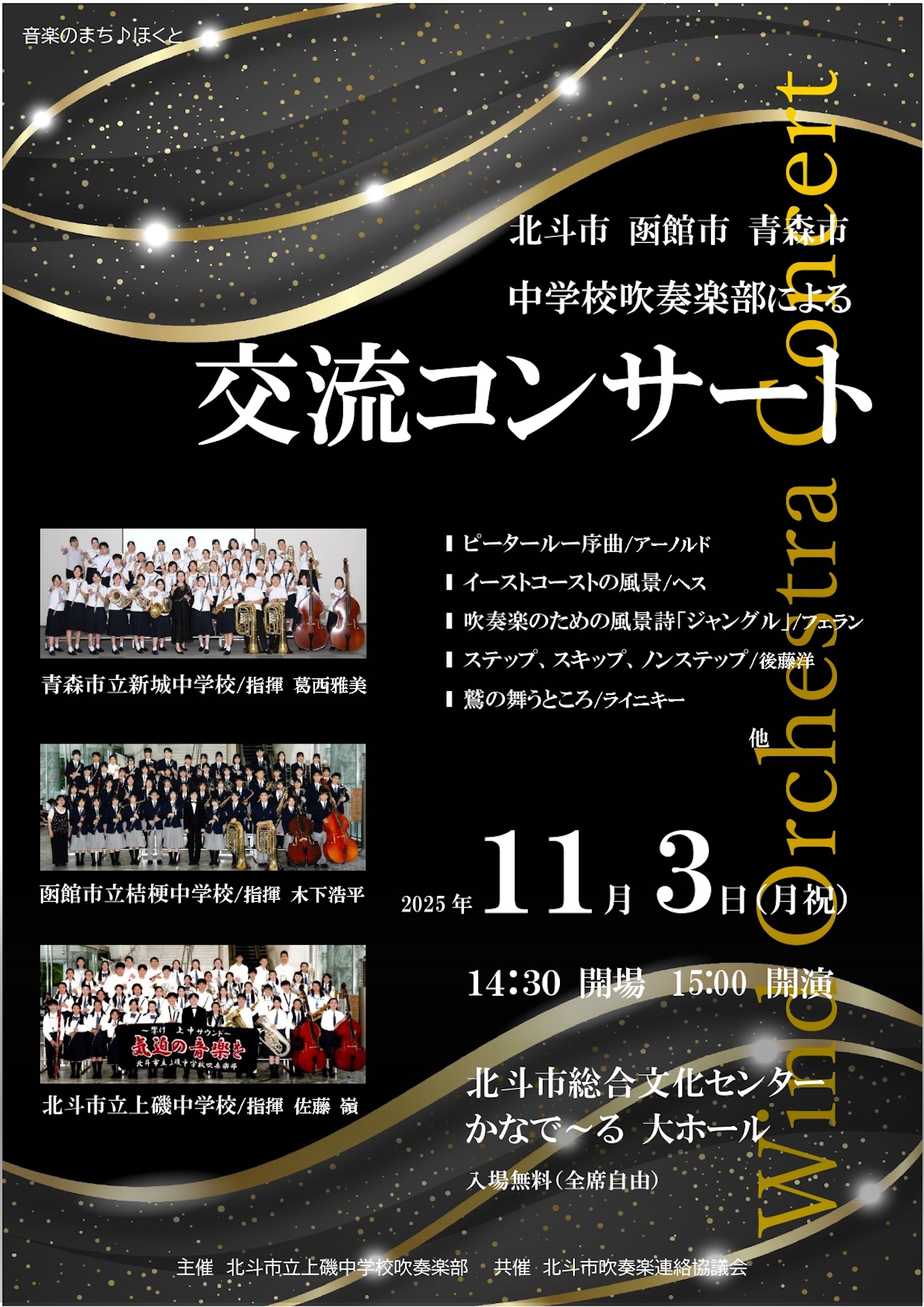 青森市、函館市、北斗市の中学生トップバンドによる吹奏楽コンサートです。