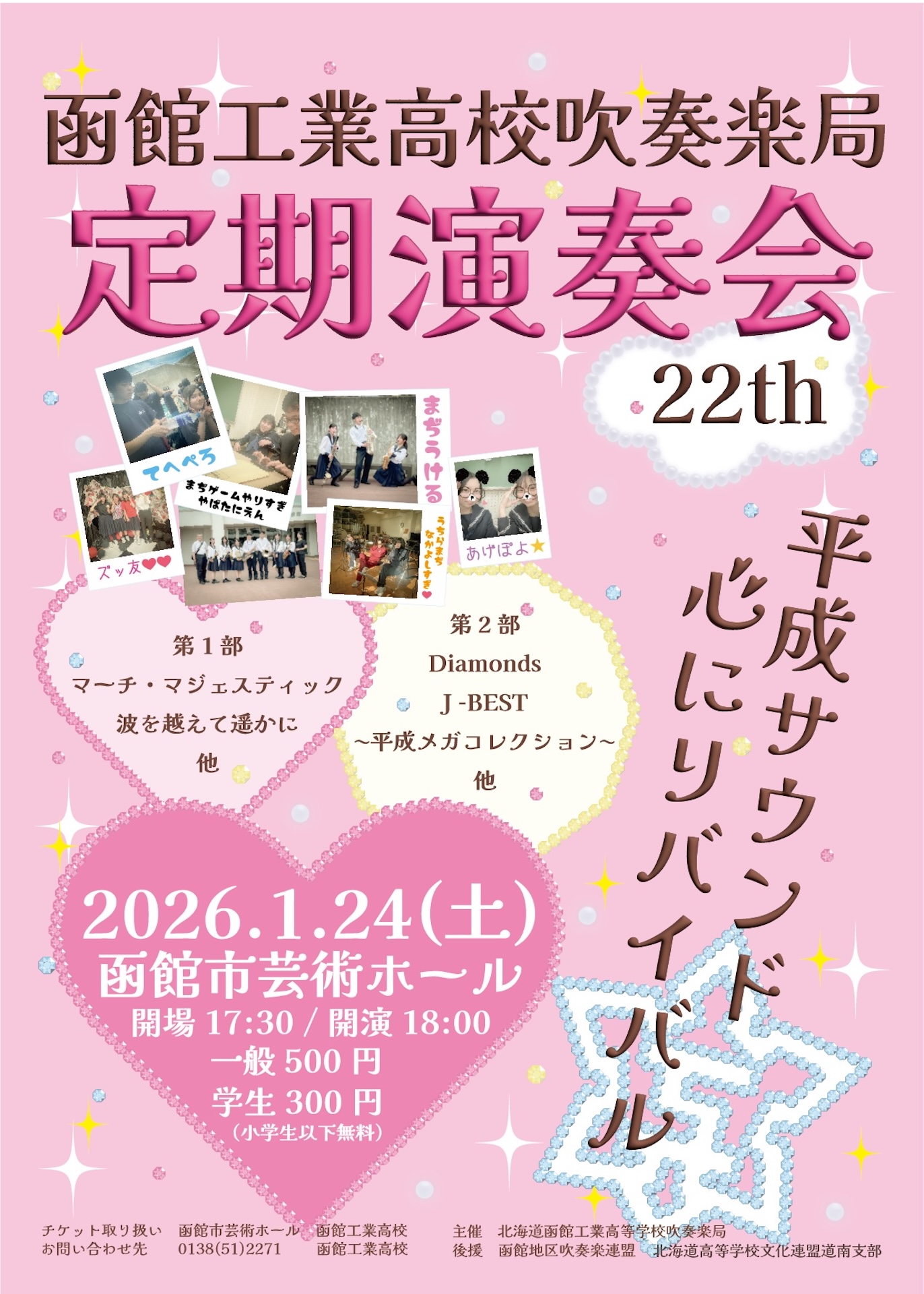 北海道函館工業高等学校吹奏楽局/第22回定期演奏会少人数ではありますが、今年度もOB・OGにご協力いただき、楽しい演奏会になるように頑張っています!ぜひご来場おまちしております! 2026年1月24日(土) まであと13日 函館市芸術ホール |
