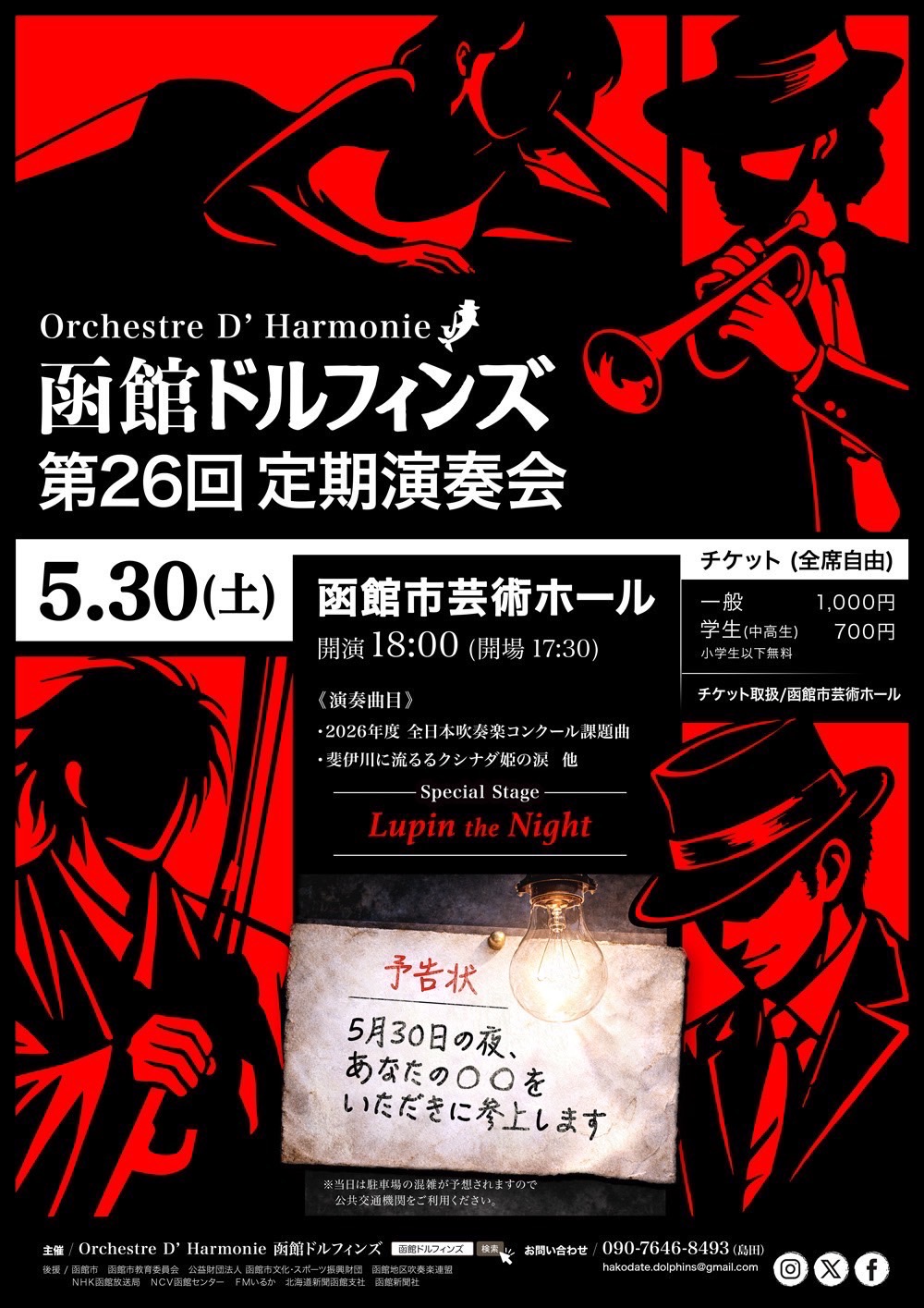 Orchestre D’ Harmonie 函館ドルフィンズ/第26回 定期演奏会皆様のご来場を、団員一同、心よりお待ちしております! 2026年5月30日(土) まであと50日 函館市芸術ホール |